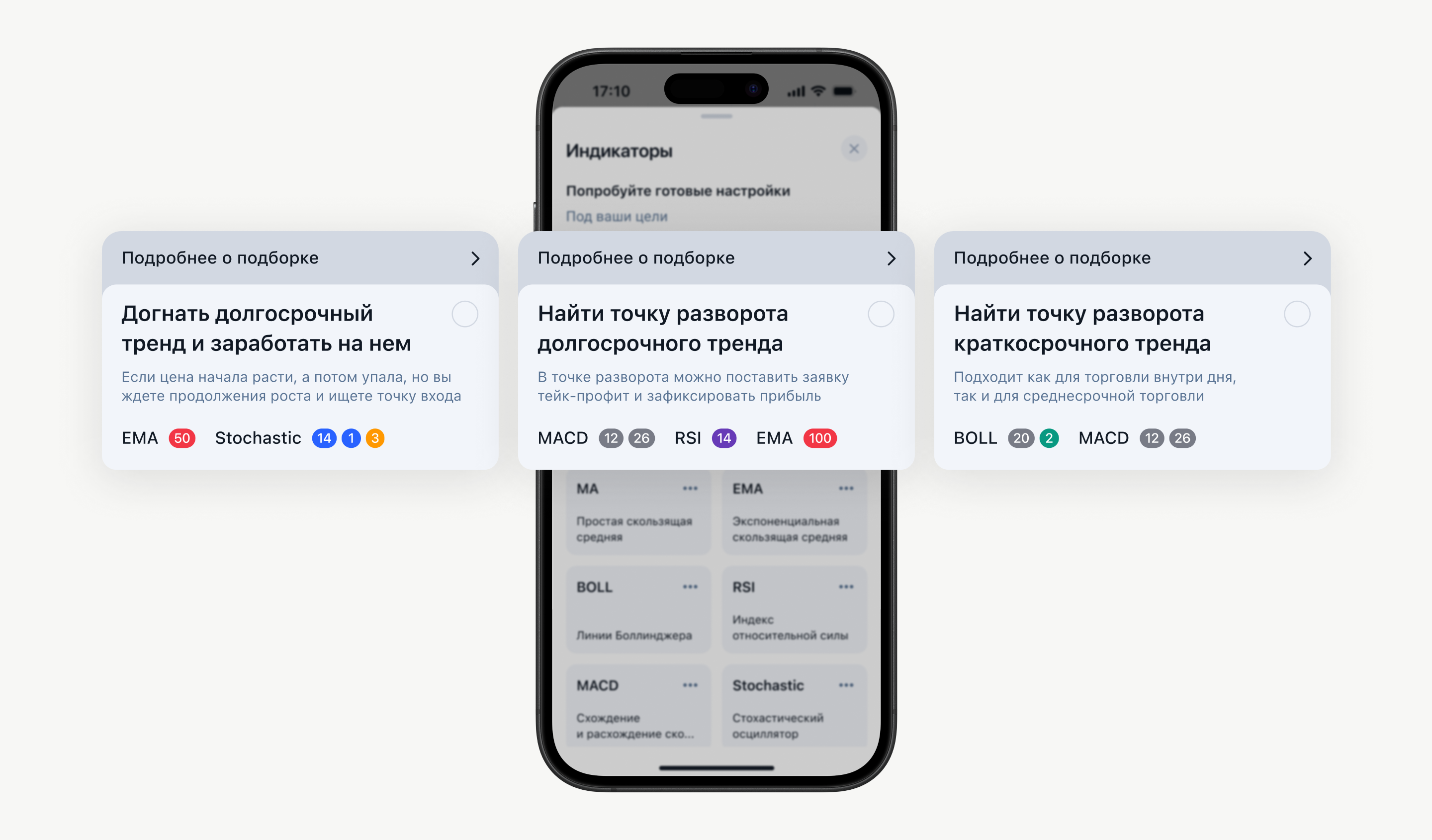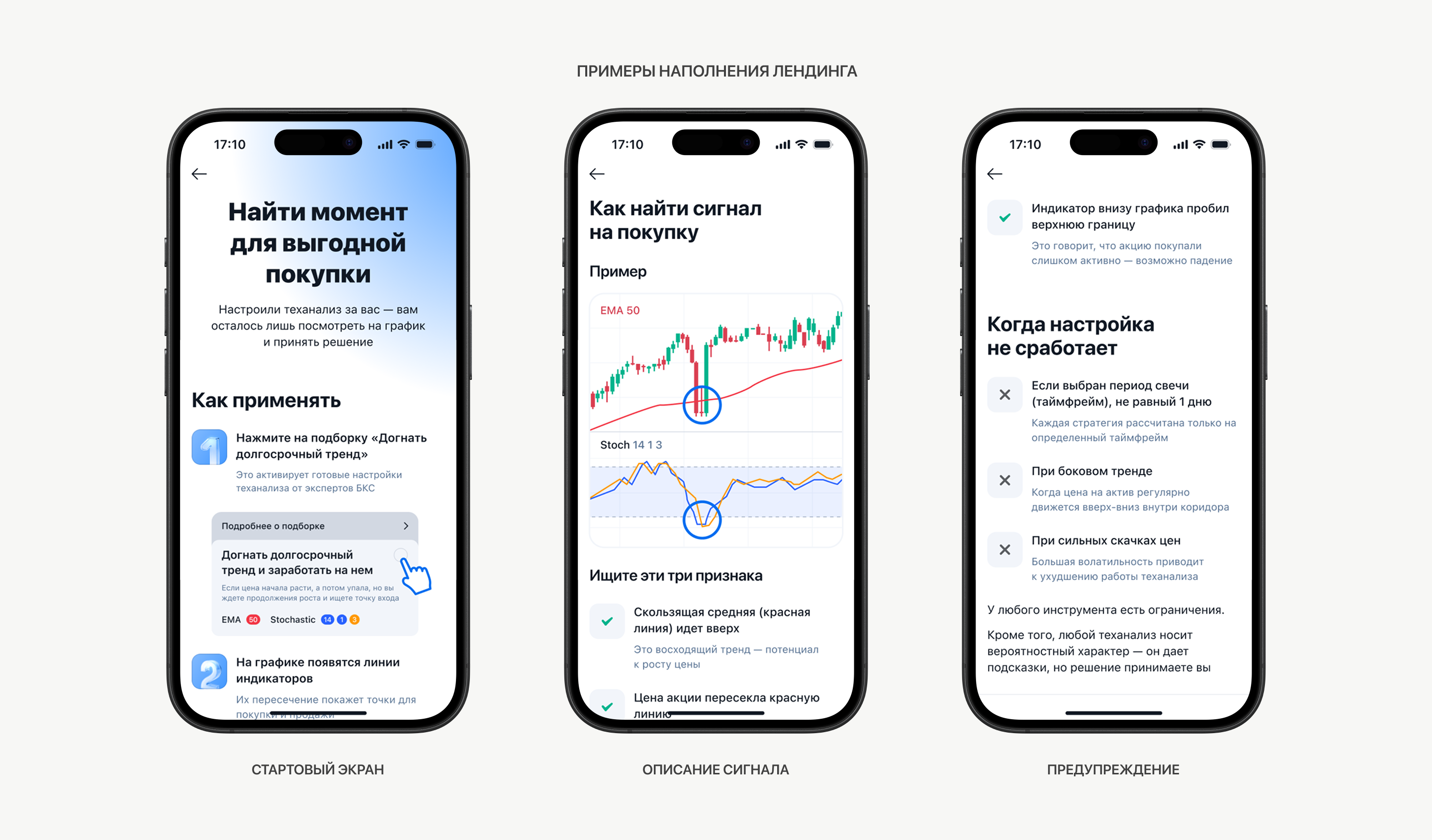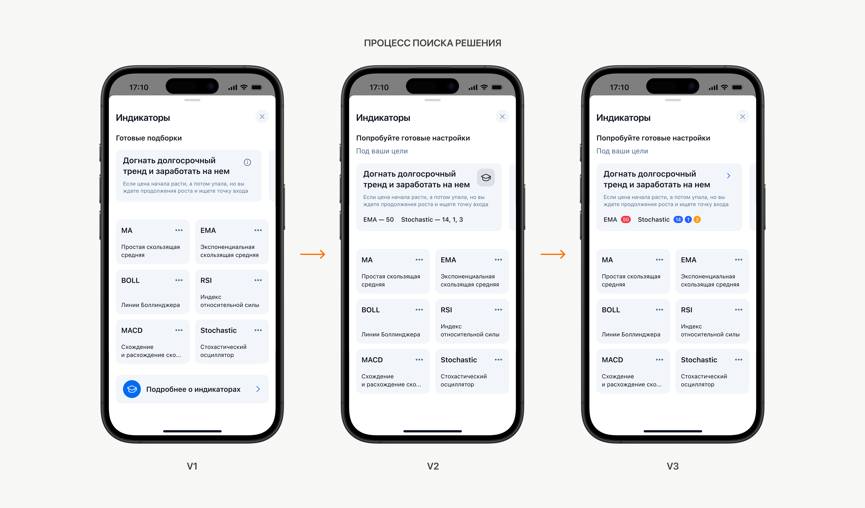 Теханализ носит вероятностный характер т.к. дает только подсказки, а не готовое решение. Важно было научить клиента видеть сигналы теханализа и адекватно принимать решение. Поэтому я активно взаимодействовал со специалистом по теханализу и UX-писателем, чтобы достоверно и качественно отразить информацию