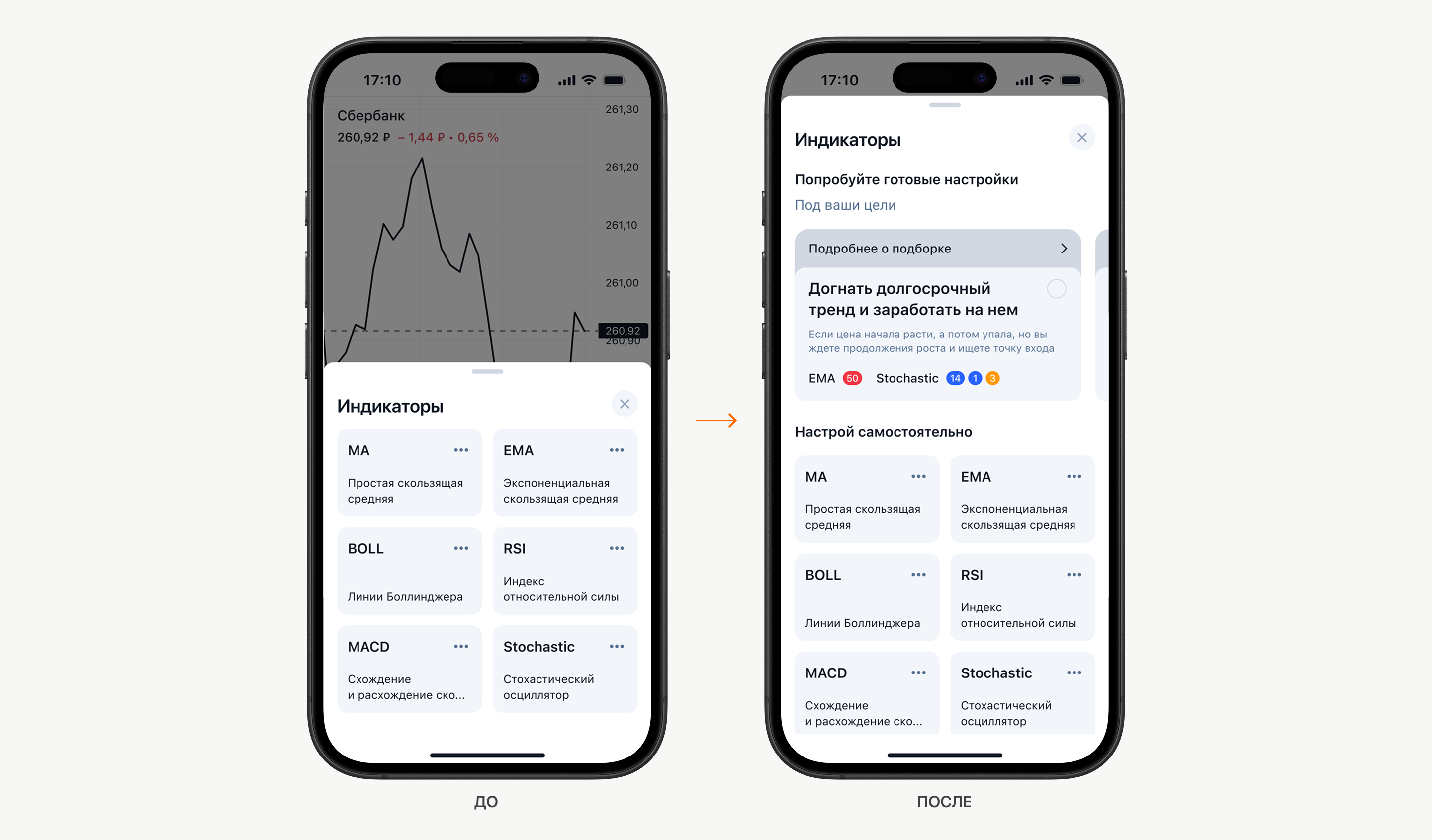 Основная гипотеза заключалась в том, что возможность по нажатию использовать предвыбранные экспертами подборки и понимать сигналы увеличит вовлеченность клиентов в теханализ и дополнительно приведет к росту их активности, за счет появления помогающей фичи.